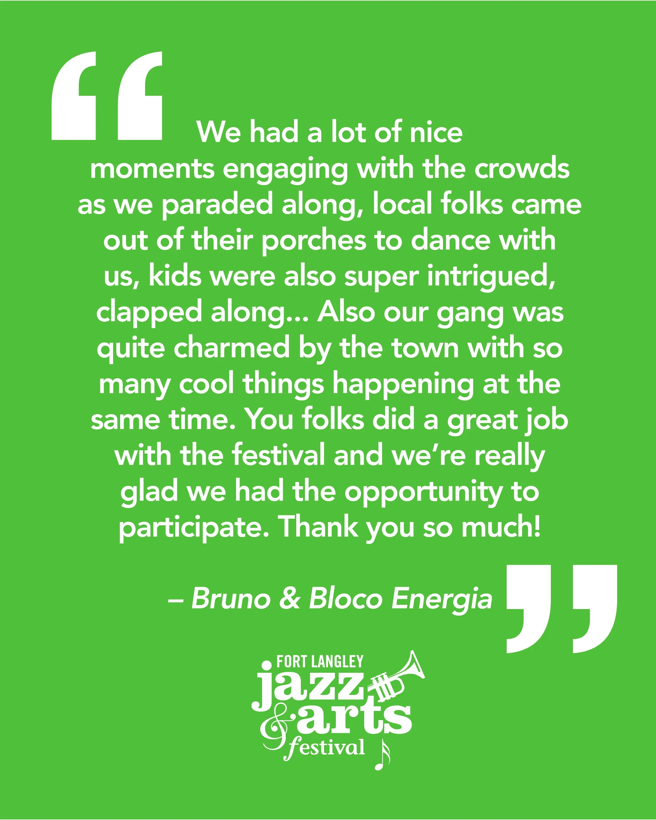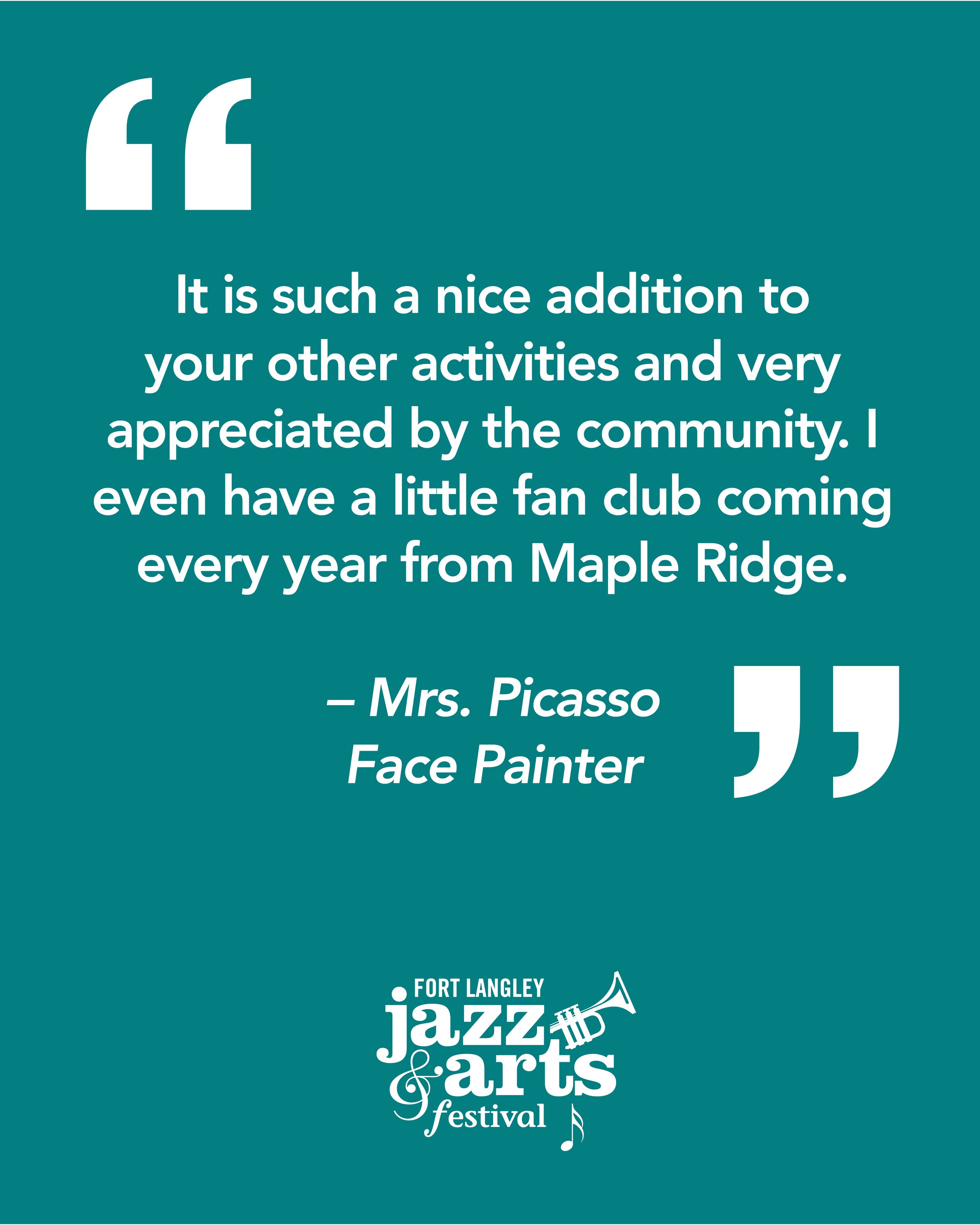“The festival was totally amazing. Everyone thought the music was incredible. I ran into some new people in town that didn’t go this year and after hearing it from their backyard have decided they need to take it in next year. Much thanks to the organizers and volunteers who worked tirelessly all weekend with a smile on their face. Never mind the people who worked all year to make this all happen. This town rocks and people in the town do too. See you all next year. Until then just remember this is the best Fort Langley Jazz and Arts Festival in the country.Keep rocking Fort Langley.”